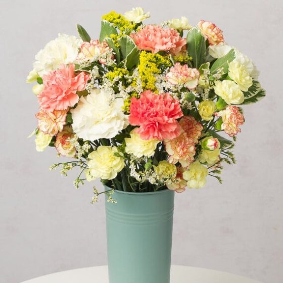 A delightful selection of long-lasting Carnations in shades of coral, cream and yellow complemented with white Limonium and Solidago blooms. We send our Carnations in bud to ensure maximum vase life and guarantee our Carnations will last for at least two weeks. Our letterbox flower gifts are delivered in specially designed letterbox friendly packaging and protected by fully compostable brown paper wrap, ensuring a wonderful and creative gift for the recipient.