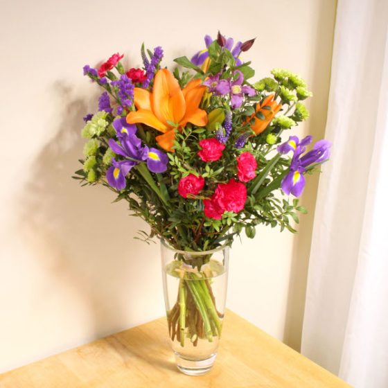 Each Jewel bouquet features fresh, hand tied flowers in vibrant purple. The combination of Alstroemeria and Veronica creates a wonderful aroma, and our added pop of orange stems make for a bit of fun to make them smile!